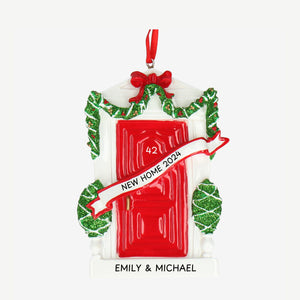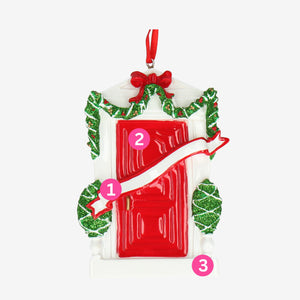 It features a bright red or green front door with a festive garland with beautiful glittery green accents. A red bow sits above the door, and a ribbon sits across the front which can be customised with your own touch marking the year of this special milestone.