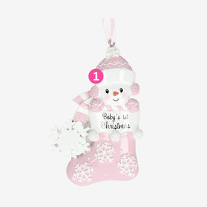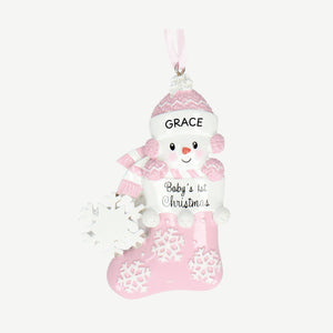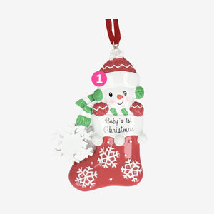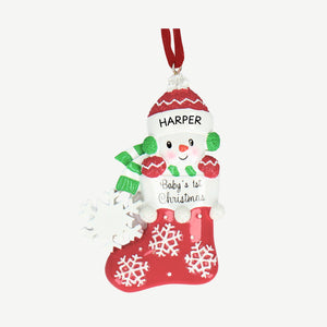 This ornament features a cheerful snowman, wearing a cozy scarf that matches the Christmas hat, peeking out of a stocking adorned with delicate white snowflakes. The snowman has a warm smile with rosy cheeks and a carrot nose. This ornament already has 'Baby's 1st Christmas' inscribed making it a charming addition to any first family Christmas together.