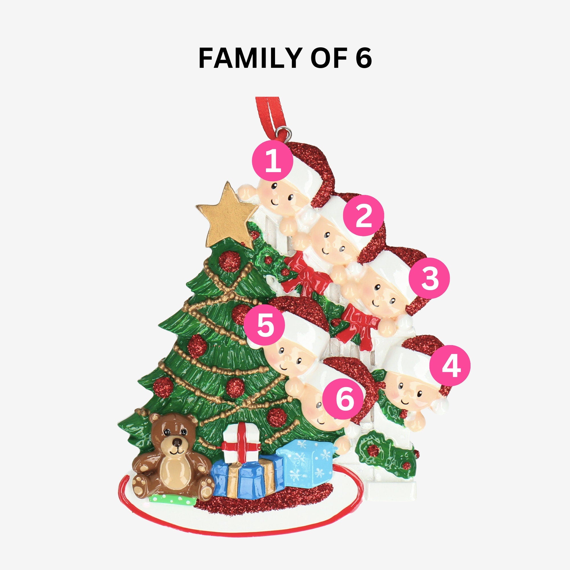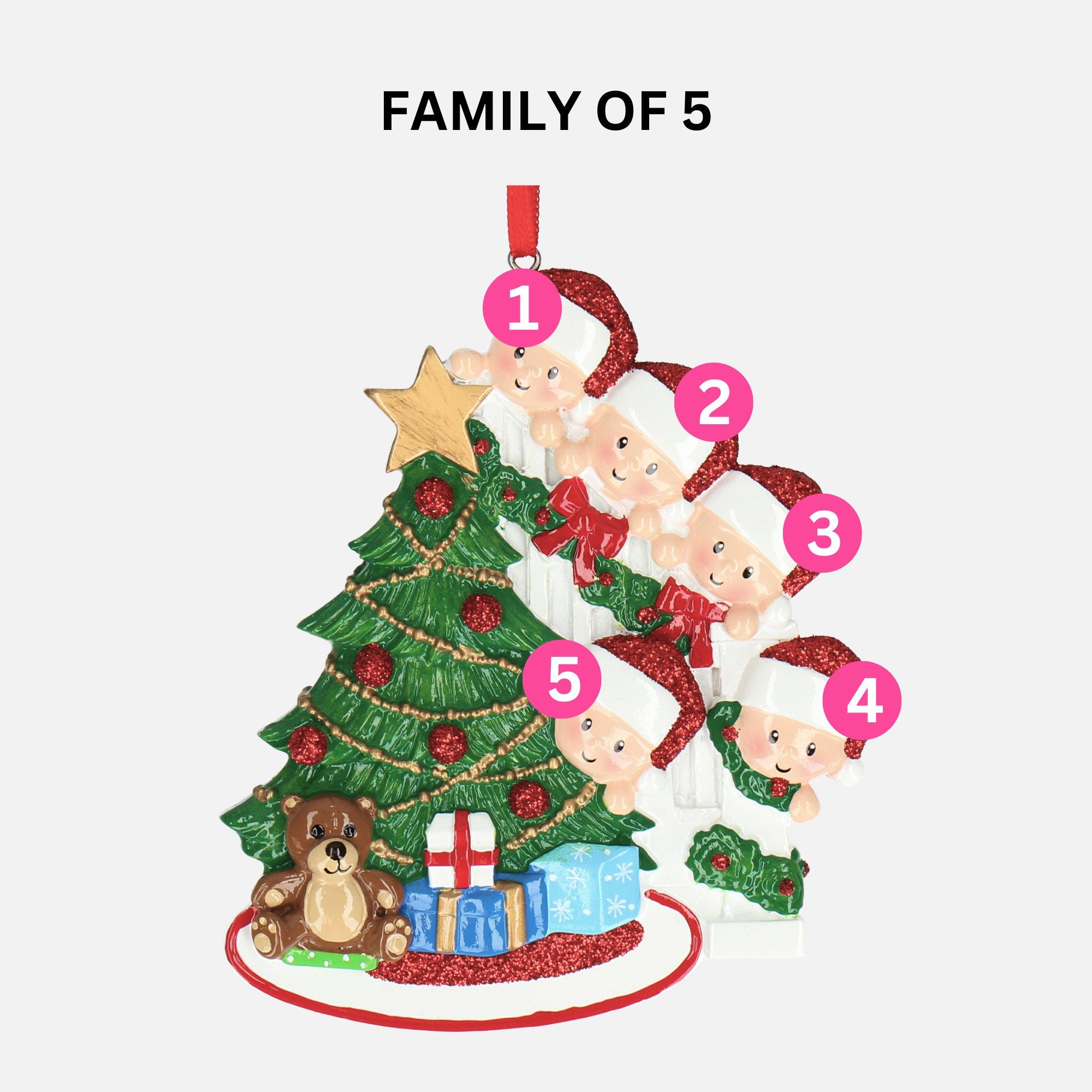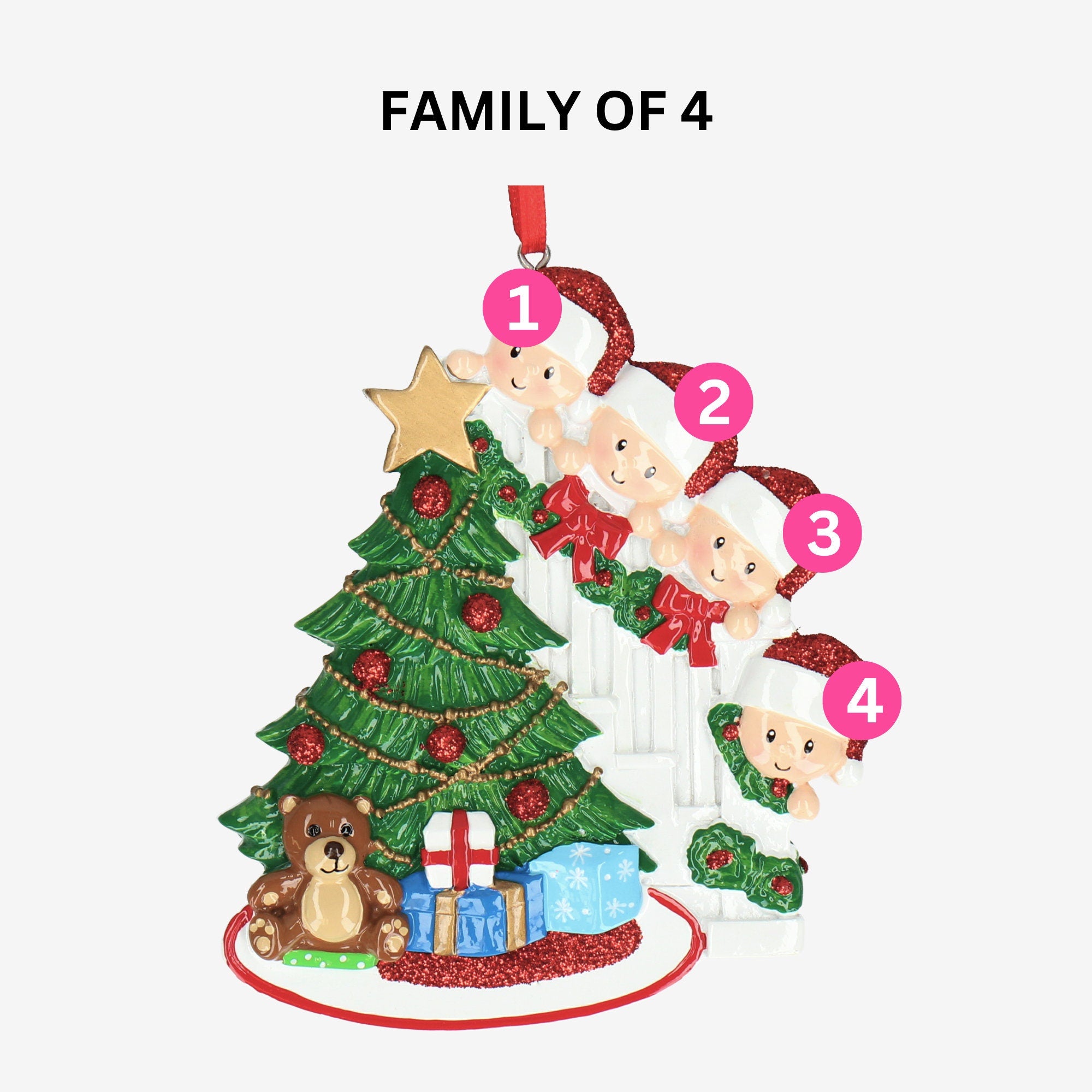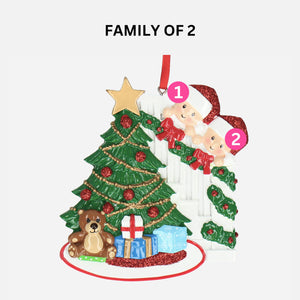 Our hand-made ceramic personalised Christmas decoration is the perfect way to add a bit of personality to your Christmas decor. It’s got five adorable Christmas Hats you can customise with the names of your loved ones—how sweet is that? Featuring a beautifully decorated Christmas tree, children in Santa hats, and adorable gifts. The centerpiece of this delightful ornament is a lush green Christmas tree, with glittering red ornaments and golden garlands, topped with a classic golden star. At the base of the tree, a playful teddy bear sits alongside brightly wrapped presents. Two cute children, wearing Santa hats and matching holiday outfits, are peeking from a staircase wrapped in a festive garland.