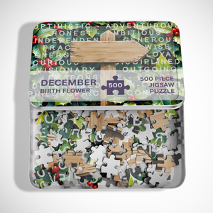 December birthdays deserve something festive and full of heart. This personalised jigsaw puzzle features holly—the classic December birth flower—symbolising protection and cheer.