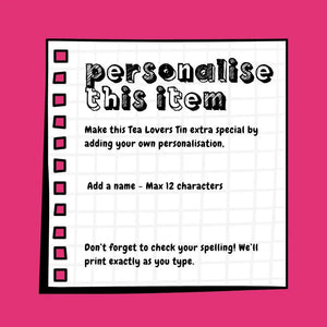 Remember to add your name to the customisation box to receive a custom-printed tea lovers tin.