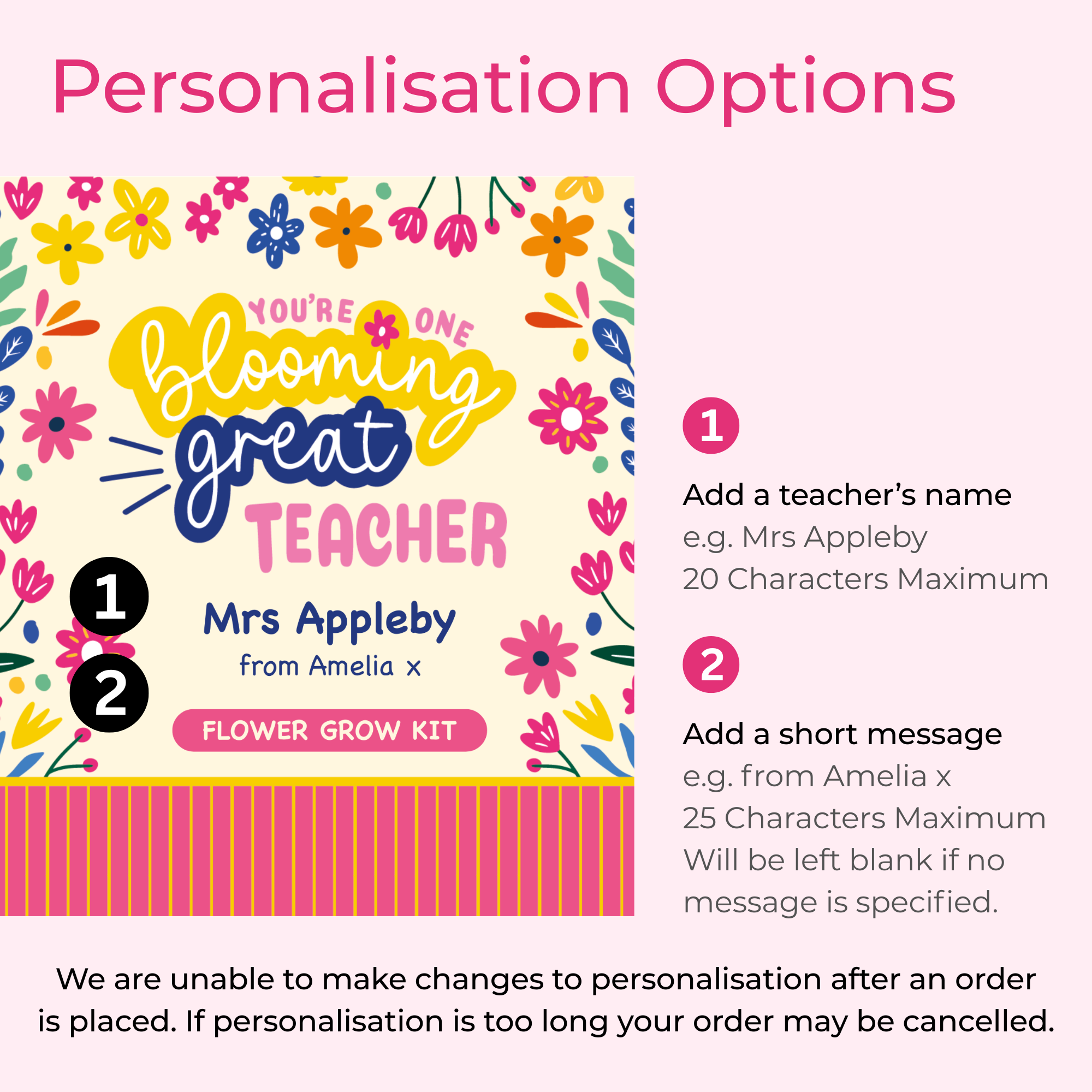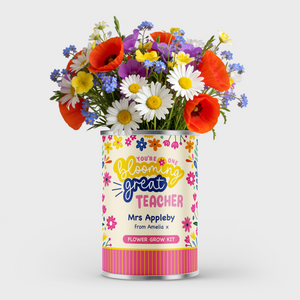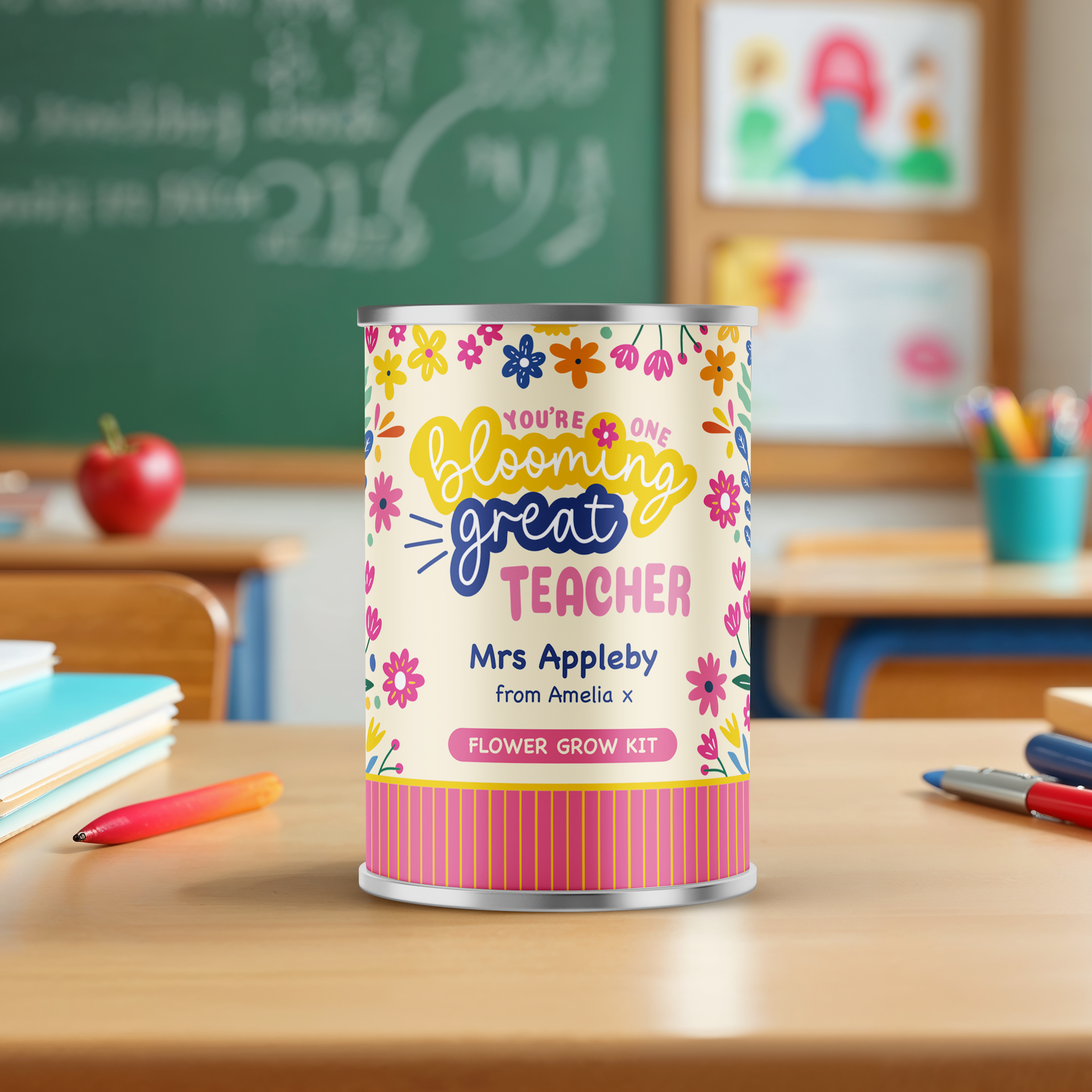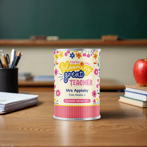 Our eco-friendly, retro-style tin is customised with a teachers name and a short message that includes everything needed to grow great flowers: