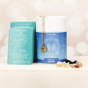 Something unique for the January birthday babies! Your favourite Cancer will love this zodiac tin containing their symbol in a necklace, birthstone, and personality card set.