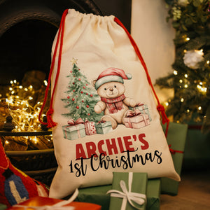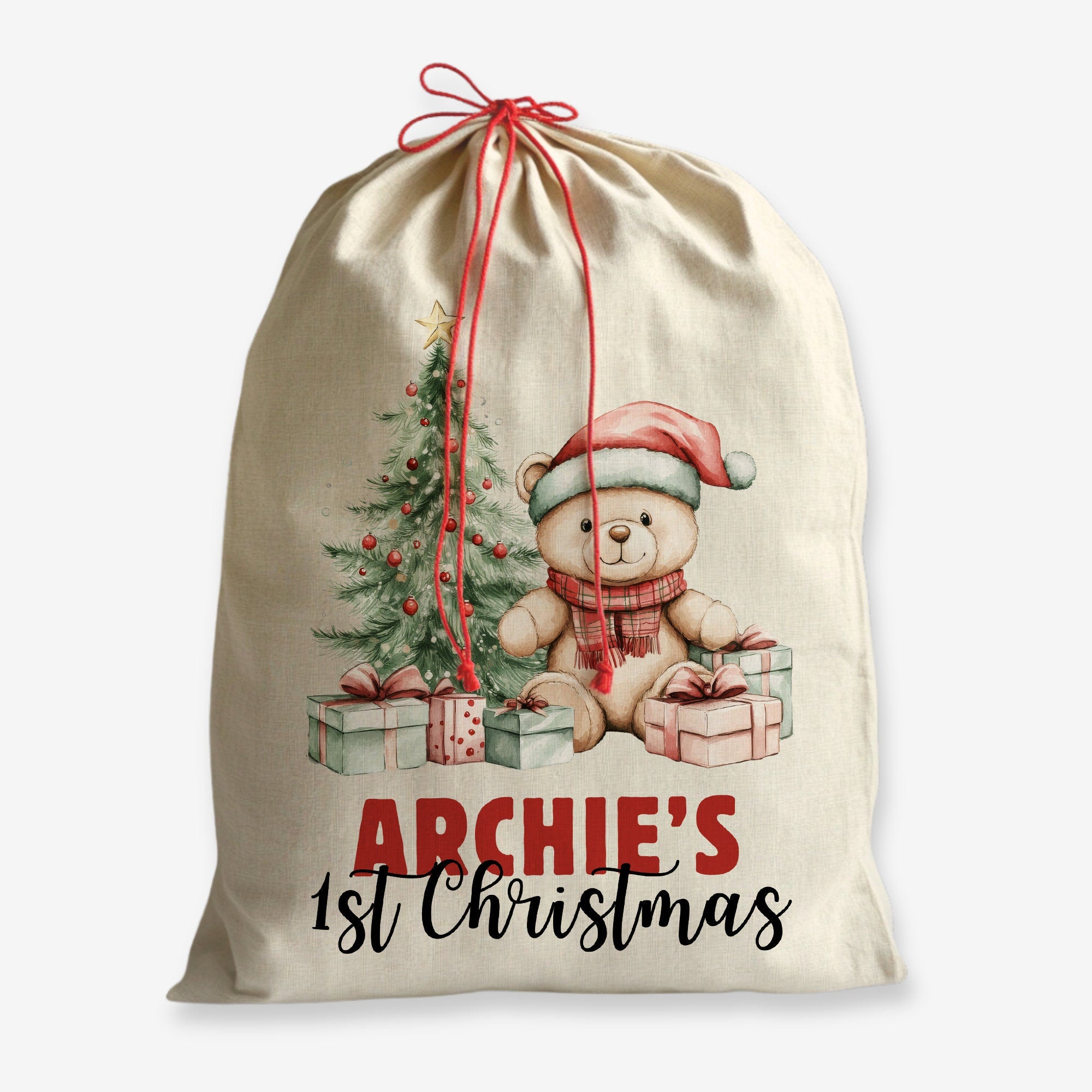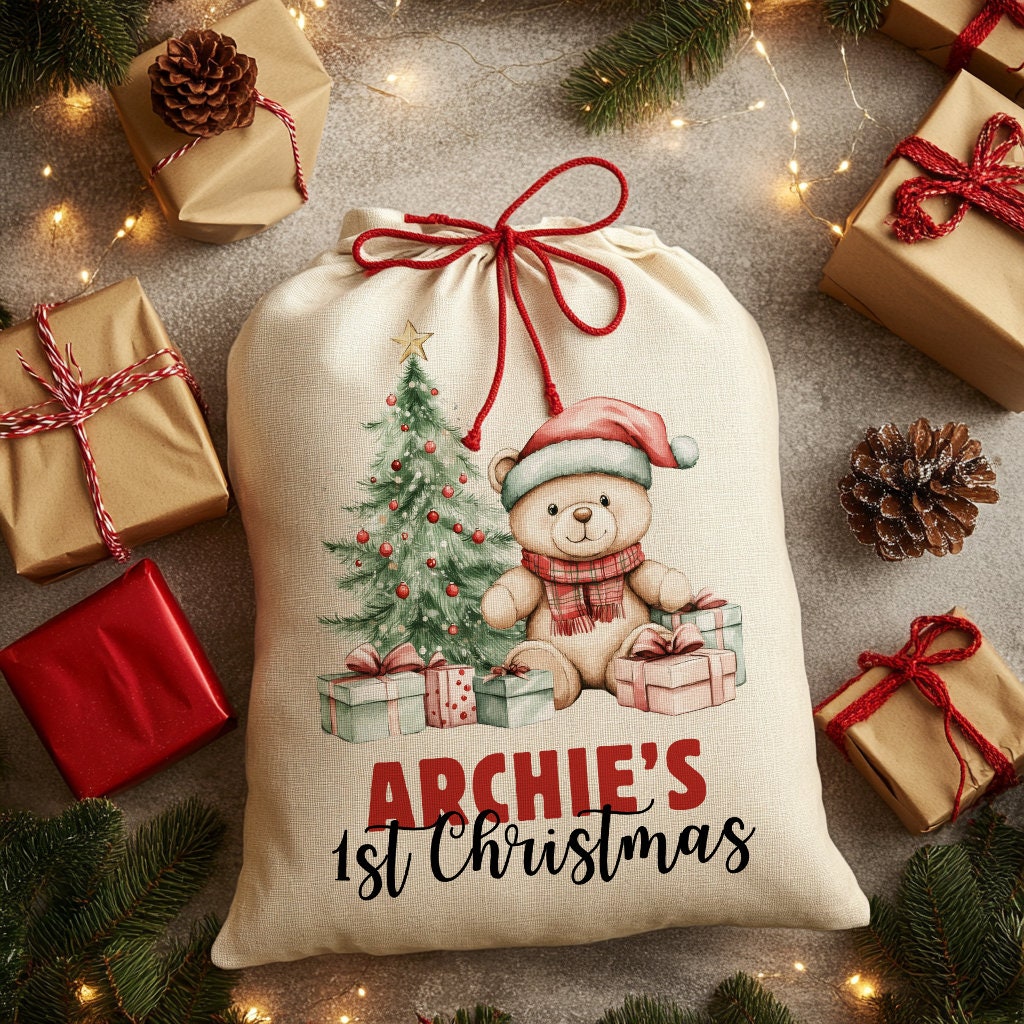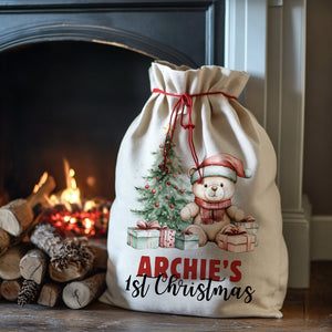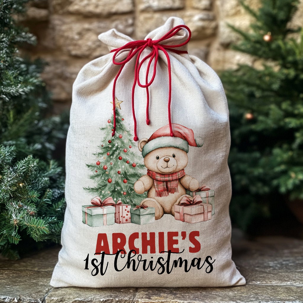 Celebrate your little one's first holiday season with our adorable personalised Christmas sack! Featuring a cuddly teddy bear in a festive Santa hat. Perfect for marking such a special milestone, this custom Christmas sack is the ideal way to make their 1st Christmas even more memorable.