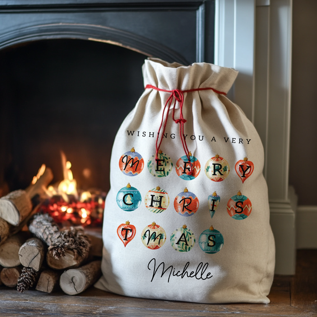 Our linen sacks measure either 30cm wide x 40cm or 60cm wide x 70cm, are made of linen and draw string to keep the contents secure, and a secret until Santa’s visit! Our design is classic, featuring the words "Merry Christmas" spelt out on individual baubles.