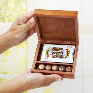 The elegant wooden box houses a premium deck of cards and a custom dice set, ideal for creating fun and unique date night ideas or even crafting your own love tokens for playful challenges.