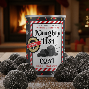 Our Naughty List Tin includes tasty marshmallows shaped like pieces of coal. Will be personalised with your chosen name for added flair.