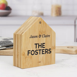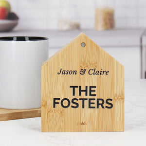 A practical yet thoughtful gift for friends or family enjoying their new home! A set of 4 stylish coasters in a house shape, printed with the couple's name and family name.