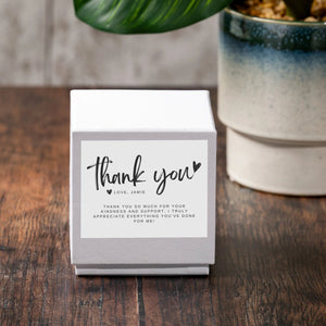 You can now choose to add a personalised candle box with your order containing the person’s name, date or other short message. Simply choose the gift box from the drop-down, and enter your message in the personalised field to create your custom candle.