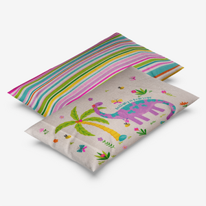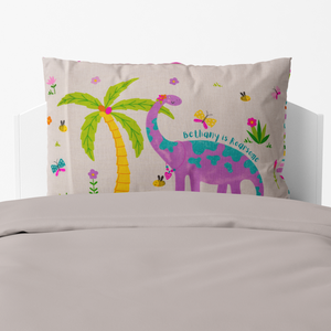 With a pleasing design the Roarsome pillowcase features your childs name running down our dinosaurs back. Cartoon images adorn the whole pillowcase which is guaranteed to bring a smile to any dinofanatics face!