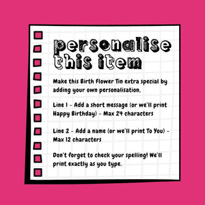 This thoughtful gift contains everything needed to grow a beautiful rose bush, packaged in a charming tin that can be personalised with your choice of name and short message.